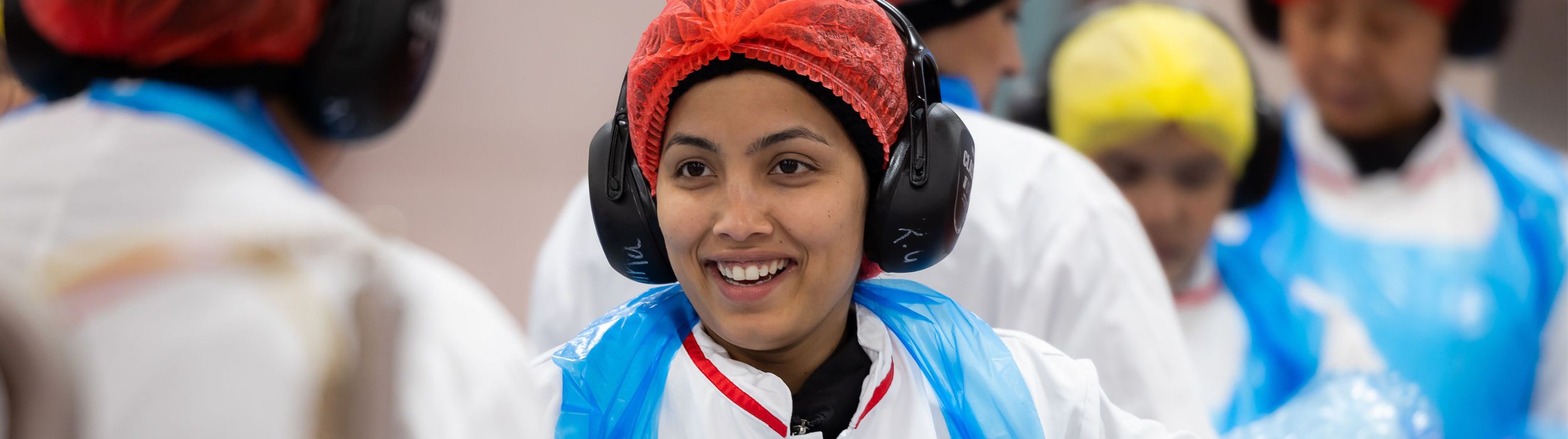 A female team member in a orange hair net is working at Chef Fresh manufacturing